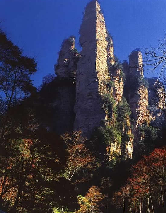 金鞭岩:过“闺门峰”沿溪而下约500米,有一座高约400米,孤标直立,雄奇挺拔的奇峰,名金鞭岩。金鞭岩是武陵源著名景点,峰体上细下粗,四棱分明。棱面布满节理横纹,形成鞭节,浑如一根竖插大地的长鞭。每当夕阳晚照,鞭身涂金,熠熠闪光,瑰丽夺目,构成一幅奇特壮美的“夕阳金鞭图”。