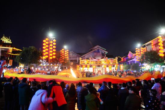 火龙出场,街区狂舞;盘龙点睛,众人祈福。12月21日,农历冬至,当天夜晚在旅游胜地张家界武陵源区溪布老街摆手堂广场启动的 “武陵腔调:赶火赶戏赶大年”活动仪式上,一条全身似火的长龙在近百名土家儿女的舞动下 “闪亮”登场,格外耀眼。据了解,这条长龙身有香味,全长108米,是目前世界最长的香火龙。