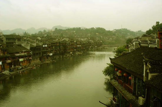 一、吊脚楼与沱江 吊脚楼里的悠悠岁月。河街,吊脚楼象供起的水波,连绵不断,古色古香,有一种自然精致的形式美。湘西独有的吊脚楼,用一块一块木版围起来,临水而居,似欲飞的水鸟。灰白相间,鳞次栉比,每一栋屋顶的飞檐似牛角般插入云天。整个建筑以山和水为依托,色调和谐而又淡雅,造型简洁而又明快。坐在吊脚楼上木格子窗边,清甜的凉粉滑润入喉,空白的思想里只有不紧不慢的小舟和不曾间断的雨点。微微支起的木檐,滴滴拉拉的水珠,平静得让人不想离开。先前因于生活步调的骤然减慢引起的茫然随着这江缓缓的流走,剩下的只是淡淡的思绪。循着江水的走向浏览这座小城,江水漂衣的拍打声,孩子们偶尔传来的嬉闹声,和着江水潺潺,水车的点缀,是一种安然。 古城的沱江,水草在清澈的江水中尽情舒展,游船在如丝绸一样平滑的水面上轻轻划过,垂钓的老翁、洗衣的阿妹,写生的画家,一切是那样和谐而安详,仿佛进入了沈从文笔下的边城意境。江水两岸的吊脚楼与山光水色浑然一体,紧凑却不拥挤,由高到低一子排开,像列阵的士兵一样。静静地凝望着脚下的沱江。 二、夜的凤凰 小街上的生意人开始准备收摊,不时有小狗从屋前经过,不远的江边有两三个洗衣服的人,隐约听见梆梆的声音。江边的吊脚楼似乎早已习惯这一切,默默地注视和陪伴着。傍晚了,雾也悄悄从山边弥漫开来。 小巷里暖暖的灯光下飘来的是肉香,熟悉的香,隐隐有茈然的味道,添了一分异地的新鲜。天渐渐暗下去,食品底楼吊脚离水更近,亮着两只雪亮的白光灯,和墙上的鹅卵石极不和谐的刺目着。 夜是凤凰美丽的一部分。凤凰的河水是清的,淡淡的清凉味道,天是纯净的黑,撒满星星,街是亮的,暧昧的暖光,酒、音乐、熟悉和不熟悉的人在暗夜掩饰下缠绵。古城门和廊桥,是两个灯光聚焦的亮点,密密匝匝的人在灯光下一堆一堆的品着烧烤。河水平静的流着,放河灯的人心潮澎湃的把心愿系在火花般红媚的河灯中,一拨一拨随波逐流。是夜,我凭着临水的栏杆,在舌尖滑过凤凰甜美的凉粉,却参不透凤凰所蕴藏的“水声倬影”。它是无法言语的美丽。 三、文化的继续 凤凰城的面积不足1平方公里,城中的小街铺了清一色似随意但却整齐的石板,光滑清亮,结结净净,石板上还有人形、鱼纹与鸟影泛动。地道的柴火担子、“米豆腐”担子穿街走巷叫卖的架势,传统的染坊、银器首饰、家制木器、草制品、铁器作坊及传统风味小吃店随处可见。在街角的土特产、民间手工艺店铺里肯定能找到你意想不到的好东西。 进入城廊,不知不觉间已被它的历史文化所感染。古老的黄丝桥城堡威严耸立,似乎依然弥漫着当年的战火硝烟,依然弦歌不断,每一处刻痕都留下感人的历史故事和深深的文化烙印。 我曾拜读过沈从文的书,仰慕之情由来已久,今天走进沈从文故居时,除了忙着追寻他的影子外脑子里一片空白,你的思想与灵魂何在?我用什么来表达我的虔诚呢!只觉得他从年少走向年少走向成功的辛酸足迹一次次地触动我的灵魂。