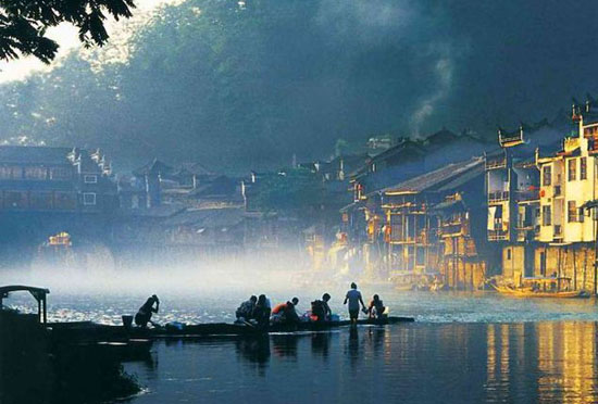 古城凤凰,有山有水,山水相依,威武却不失妩媚,轻盈却更显厚重。凤凰一如从前一样古朴,悠悠而逝的江水,穿过花香的两岸,将古城轻盈地揽入怀中。一种静谧的美,像暮色,氤氲如烟。河畔,阵阵杵声与浣衣女的欢声笑语响应和。江心,渔舟双浆点水,几点庸懒的鱼鹰随渔翁的号子扎进水里,荡起圈圈涟漪,恰似你扩展你的思绪。